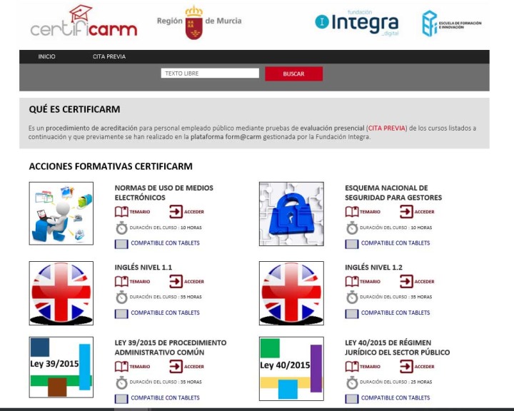Los cursos "Normas de uso de medios electrónicos" y "Esquema Nacional de Seguridad para Gestores" se podrán realizar a través de la plataforma de tele formación form@carm y, posteriormente, certificar mediante una cita previa para realizar una prueba de evaluación con el Programa Certificarm.
