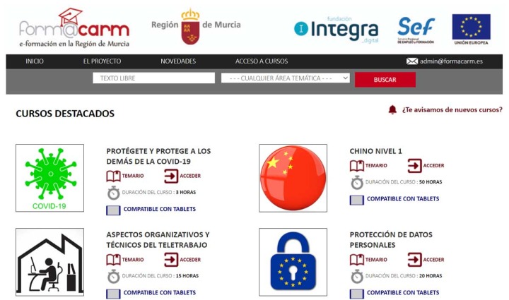 La Fundación Integra, adscrita a la Consejería de Presidencia y Hacienda, es la encargada de gestionar el portal Formacarm, que suma ya un total de 22 cursos de idiomas de diferentes niveles: once de Inglés (hasta el B2), cuatro de Francés (hasta el A2), tres de Alemán (hasta el A2), dos de Lengua de Signos (hasta el A2), uno de primer nivel de Italiano y ahora el primero de Chino.