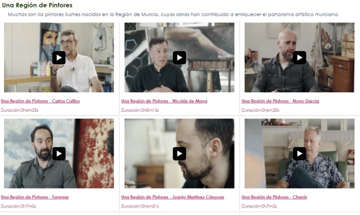 La Comunidad ha creado una ‘miniserie’ en la que cada uno de los diez capítulos que la componen repasa la obra de un pintor actual de la Región de Murcia y detalla sus orígenes, estilos, influencias e inspiraciones. Con el título ‘Una región de pintores’, estas piezas audiovisuales de la Fundación Integra se encuentran disponibles tanto en la web cine.patrimonio.digital como en el canal de Youtube ‘Un patrimonio de cine’.