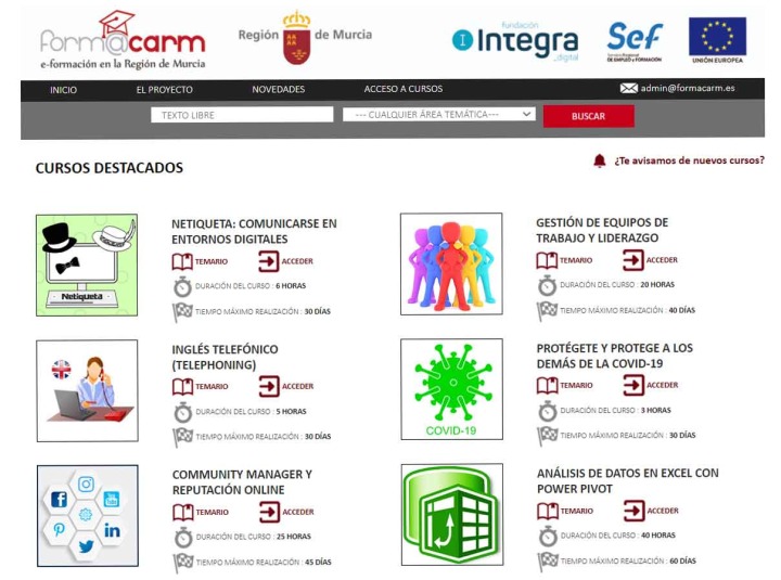 Los ciudadanos de la Región de Murcia tienen a su disposición de manera gratuita y ‘online’ un total de 23 cursos centrados en las TIC, la ofimática y la programación, de cara a adaptar sus perfiles profesionales a competencias digitales cada vez más requeridas tras la pandemia. Esta formación se encuentra activa en el portal Formacarm.es, desarrollado por la Consejería de Presidencia y Hacienda a través de la Fundación Integra.