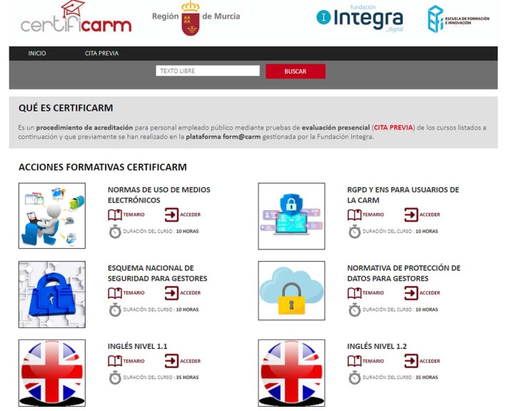 Para inscribirse a estas pruebas se debe realizar previamente el curso completo en línea a través de la plataforma ‘Formacarm’, gestionada por la Fundación Integra, y obtener el certificado de superación que esta entidad expide a su finalización. Una vez superadas estas pruebas, la Escuela acredita e inscribe estos cursos en el Registro de Formación del personal empleado público.