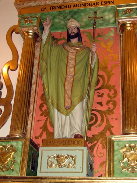 Se trata de la representación de San Fulgencio, santo español, doctor de la Iglesia católica, y obispo de Cartagena y de Écija.