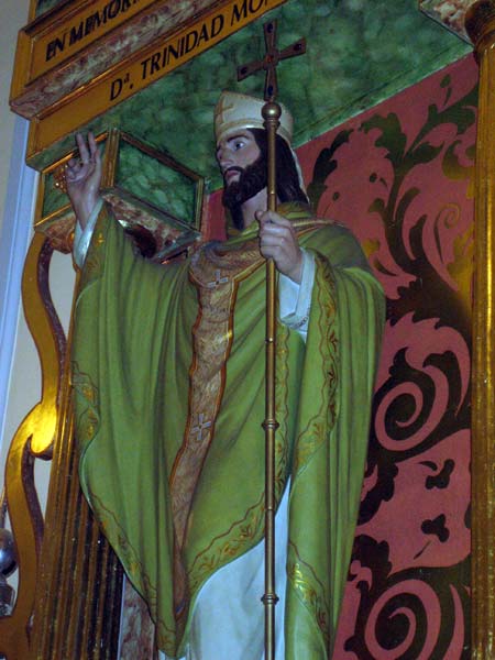 Está ataviado con el traje de obispo, con mitra y bastón como jefe de la iglesia.
