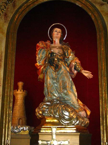Se trata de la escultura de Santa Bárbara. La figura de Santa Bárbara esta arrodillada en actitud de ruego. La cabeza erguida y ligeramente vuelta hacia la izquierda. Su mano derecha sobre el pecho cerrando la composición mientras que el brazo derecho esta totalmente despegado del cuerpo creando así una escultura de composición abierta. Esquema compositivo que más adelante copiaran algunos de sus discípulos.