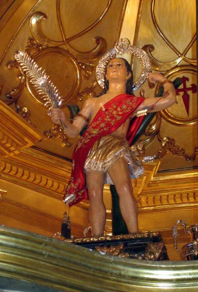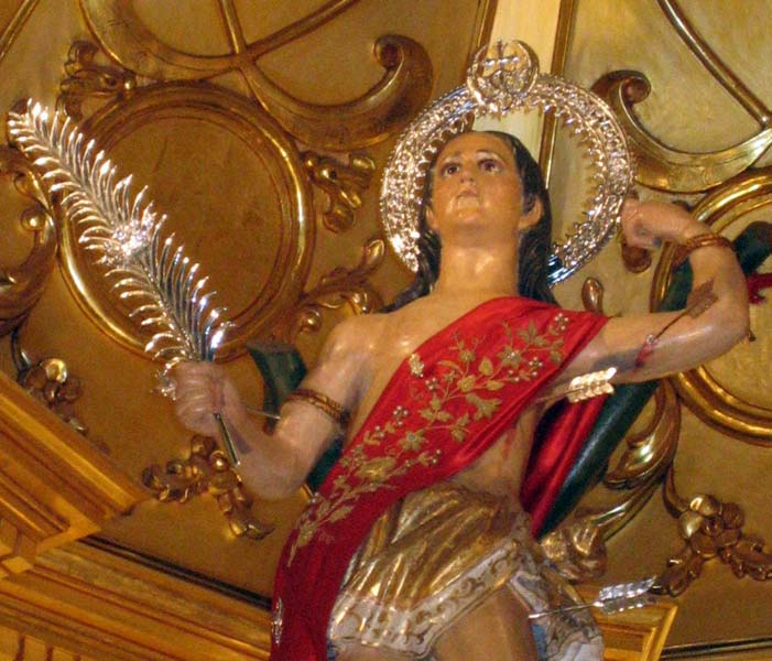 Se trata de la imagen de San Sebastián asaetado por flechas, primero de sus martirios.