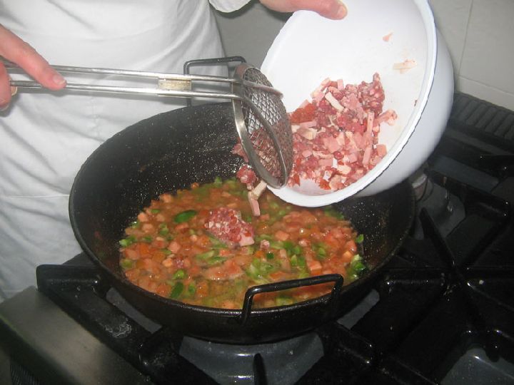 Cuando esté el sofrito, añadir el preparado de carne y rehogarlo.