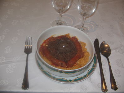 Corregir de sal e incorporar la longaniza y las morcillas fritas.