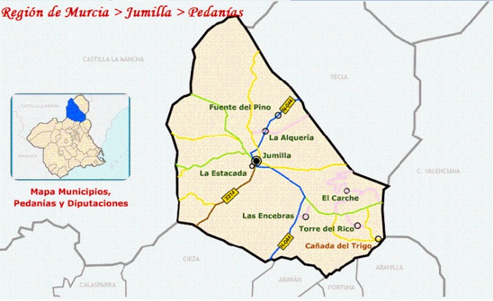 Se encuentra a 1 kilómetro al sur de la ciudad de Jumilla y a 70 kilómetros al norte de Mucia capital.