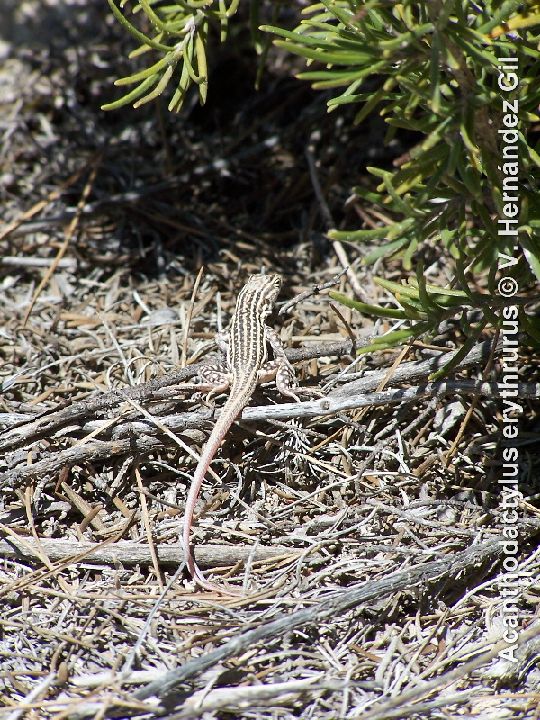 Su aspecto robusto no le impide desplazarse a una velocidad sorprendente por terreno suelto, para lo que se vale de las expansiones laterales de los dedos, que aumentan la superficie de sustentación, y de levantar en la carrera la cola. Estas rápidas carreras le permiten cubrir la distancia entre dos retazos de vegetación, hacia su refugio, al ser sorprendida en un espacio abierto. Mantiene casi siempre una postura erguida, enterrando sus patas entre la arena en las horas de máximo calor. Excava pequeñas huras con sus potentes garras, en las que busca refugio. En una de estas huras, bajo una piedra, una lagartija colirroja convivía con un sapo corredor, enterrado a pocos centímetros de ella, durante el invierno.