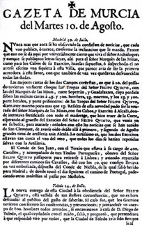 Durante el verano del año 1942 aparecieron en un almacén de papel viejo de El Grao de Valencia tres ejemplares de un periódico, hasta entonces desconocido, llamado Gazeta de Murcia. Los números, que correspondían a los días 10 y 24 de agosto y 23 de septiembre de 1706, estaban sueltos y desencuadernados, por lo que resulta imposible saber si formaban parte de una colección más completa; si bien, la ausencia de información en el último ejemplar sobre un episodio histórico tan importante como la batalla del Huerto de las Bombas, que acaeció el 4 de septiembre de ese año, nos permite afirmar, casi con absoluta certeza, que se publicaron otros números de este periódico que no han podido ser rescatados. Además, algunas fuentes de la época afirman que la imprenta de Vicente Llofriú, la misma que sacó a la luz Gazeta de Murcia, estampó unos papeles con el relato de la batalla, sin que las propias fuentes especifiquen si ese relato forma parte, como parece probable, de un ejemplar de Gazeta de Murcia.