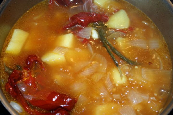 Se cuecen las alubias junto a los pimientos secos. A la mitad de la cocción de las alubias se añaden las patatas cortadas, la cebolla, pelada y partida y un generoso chorro de aceite de oliva.