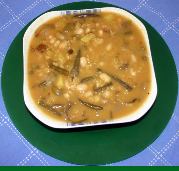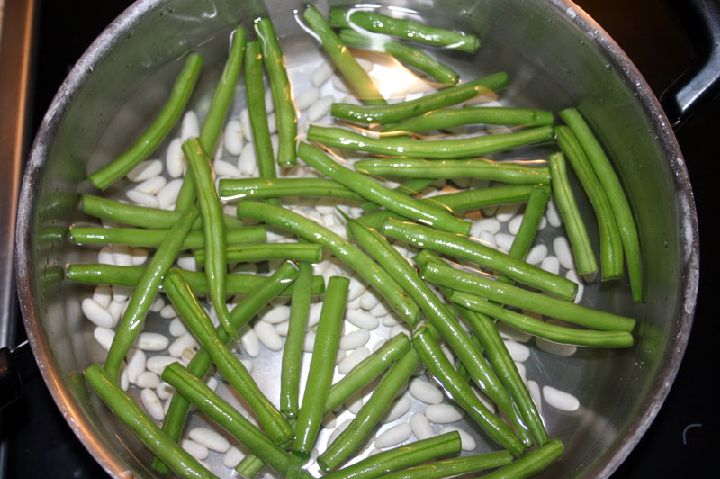 Se coloca al fuego un recipiente con agua hasta que el mismo llegue a punto de ebullición. Una vez que el agua ha hervido se le agrega un poco de sal, las habichuelas y las judías verdes (previamente lavadas y cortadas). Se cocinan a fuego lento hasta que estén bien cocidas.