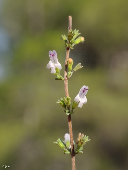 Pequeño arbustillo perenne, de hasta 50-70 cm de altura. Tallos muy ramificados e intrincados, numerosos y paralelos entre sí, que parten de cortos troncos de apenas 0,5-1 cm. de grosor. Hojas casi ovales, espatuladas, de extremo romo, cortas, 5-10 mm de longitud. Flores axilares, en grupos de 3-5, distribuidos a lo largo del tallo a modo de espiga. Corola bilabiada, de cinco piezas y tubo marcado, 6-7 mm., petalos rosado-blanquecinos. Frutos (2) 4, tipo núcula, en el interior de los cálices, persistentes en la fructificación.