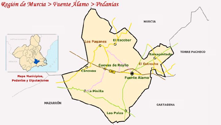 A 6 kilómetros de la capital municipal de Fuente Álamo. Al norte se sitúa el sector sur occidental de la Sierra de Carrascoy, y al suroeste el de Sierra del Algarrobo