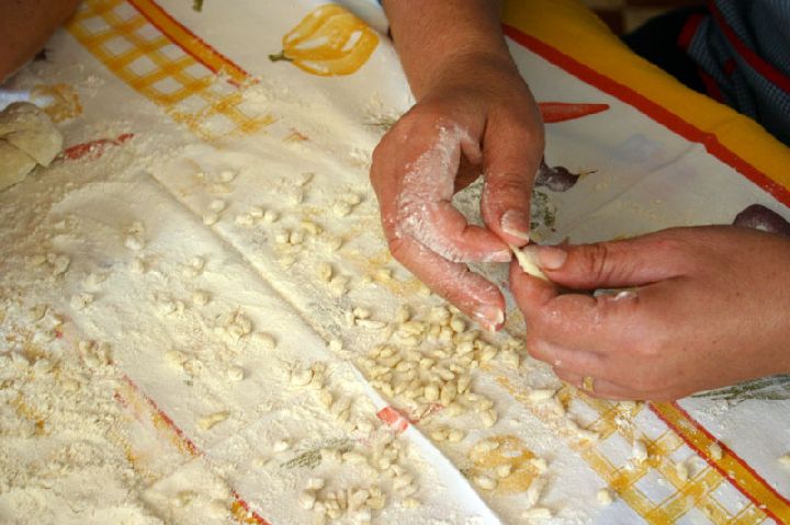 Se enharina una superficie y se van haciendo los gurullos colocándolos sobre la harina, si es necesario se va añadiendo más harina y se rebozan en ella los gurullos para que no se peguen.