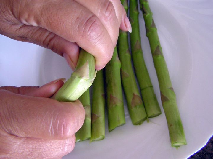 Primero, debemos cortar de los espárragos la parte del tallo que no es comestible por su dureza. Es un proceso muy sencillo. Vamos doblando el espárrago por la mitad hasta que éste se corta de forma natural. Una vez hecho esto, los lavamos bajo un chorro de agua.