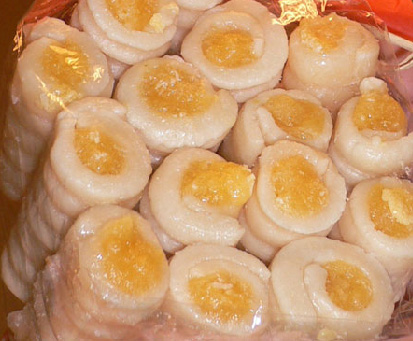 El relleno se hace añadiendo las yemas pasadas por un tamiz y muy poco a poco a un jarabe a punto de hebra flojo que habremos hecho con el azúcar y el agua. Hay que darle vueltas sin parar con una espátula o cuchara de madera y ponerlo a cocer a fuego muy suave hasta que espese. Luego se deja enfriar.