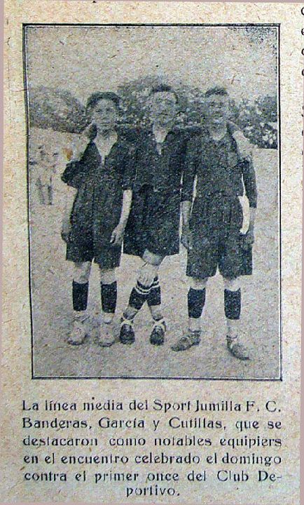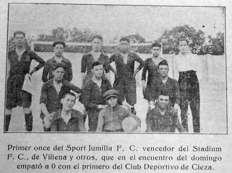 El 23 de mayo de 1924 ha pasado a la historia del fútbol jumillano, ya que ese día se disputó el primer encuentro en el que tenemos constancia que un equipo de Jumilla logró una victoria sobre un rival. Se enfrentaron el Sport y el Stadium de Villena. El encuentro acabó con la victoria del equipo de Jumilla por 2-0. Además del resultado, hemos podido rescatar la alineación del Sport, un once inicial que también queda para la historia, pues es la alineación más antigua que se conserva de un equipo de fútbol de Jumilla. El Sport alineó a González, Santos, Chuano, Cutillas, Mateo, Banderas, Torá, Ramón, Germán, Diego y Medina. Los goles los marcaron Torá y Medina.