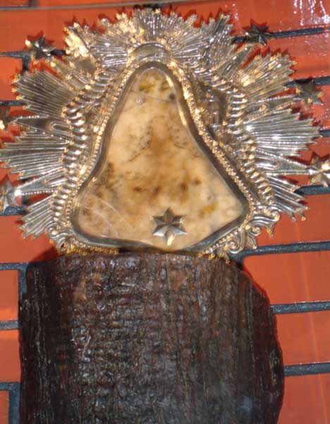 Rodríguez afirma que en noviembre de 1811, un minero que venía de La Unión y que estaba estaba enfermo de silicosis se dirigía a su casa que se encontraba en estos pagos, cuando vio una luz al pie de un árbol. Al acercarse encontró una piedra triangular de alabastro con el dibujo de la Virgen. Al día siguiente se la llevó al sacerdote de Torre Pacheco que la guardó en la sacristía conviniendo con el minero en verse más tarde para que a la noche fueran al lugar donde había aparecido. Llegada la noche, el sacerdote fue a buscar la piedra para llevarla consigo con el fin de reproducir los hechos acontecidos el día anterior, pero no la encontró, preocupados el sacerdote y el minero decidieron hacer su visita al lugar donde fue encontrada. Mientras iban llegando al sitio el minero vio la luz al pie del árbol y allí encontraron de nuevo la imagen. El sacerdote se la llevó para dar cuenta al Obispo de lo sucedido y solicitar el debido permiso para levantar una ermita a la Virgen en el sitio elegido por ella.