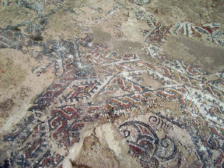 En uno de los extremos del edificio, junto a una gran habitación, se excavó otra estancia, que cuando fue construida era de planta rectangular, pero que fue transformada en otra de planta absidal. En esta habitación se excavó uno de los mosaicos mejor conservados de la villa que, aunque afectado por la reforma descrita, se puede reconstruir perfectamente su decoración. Se trata de un pavimento geométrico compuesto por una orla bícroma (blanco y negro) de círculos donde se inscriben flores cuatrípetalas, a la que le sigue otra orla de esvásticas entralazadas; a continuación, otra orla en la que se dispone un rectángulo en el que se inscriben tres rombos. Los motivos centrales se encuentran peor conservados, pero podría tratarse de una nueva orla, rematada en sus esquinas por cuadrados que encierran rombos. Los demás mosaicos de la villa presentan motivos decorativos similares al descrito.