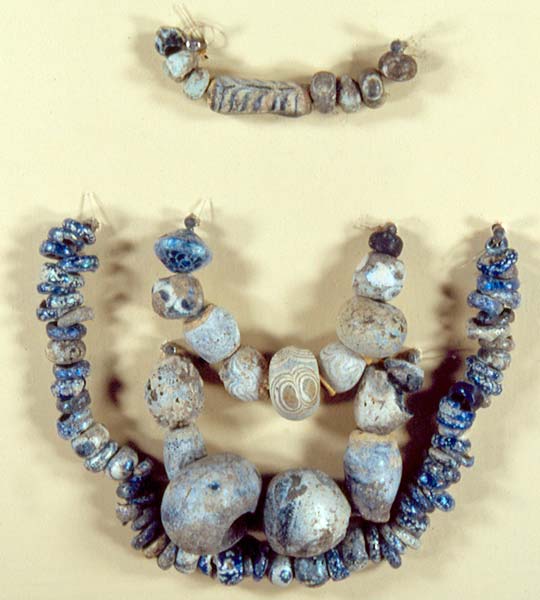 Parte de los collares que muestran orgullosas las grandes damas de la estatuaria ibérica, como las de Elche, Cerro de los Santos, Baza o Cigarralejo están, sin duda, confeccionados con cuentas de collar de pasta vítrea y nos ofrecen una imagen de cómo pudo ser el aspecto engalanado de las mujeres ibéricas de alto rango.