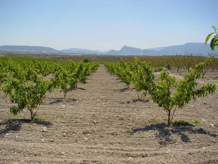 La distribución agraria queda constituida por explotaciones menores de 5 hectáreas (cerca del 45%), entre 5 y 10 hectáreas (15%), entre 10 y 20 hectáreas (15%) y mayores de 20 hectáreas (25% restante). Esta parcelación disminuye la rentabilidad de los cultivos leñosos, mayoritariamente de frutales. La red de distribución de los riegos se realiza mediante acequias y el riego a manta, aunque en grandes fincas se realiza el riego por goteo y aspersión.