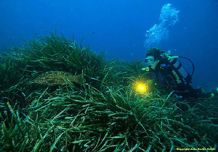 La pradera constituye una de las unidades paisajísticas más típicas de nuestro litoral, que puede extenderse desde casi la superficie hasta sobrepasar los 30 m de profundidad, aunque lo normal es que comience sobre los 3-5 m, después de una franja de arenas superficiales, de césped o de roca bien iluminada. Es el paisaje que más superficie ocupa en los fondos de la Región, pero que suele ser rehuido por los buceadores al considerarlo monótono y aburrido (figura 2). Esta apreciación desaparece en cuanto se visita con cierta curiosidad y se descubre la cantidad de vida que pulula a su alrededor (figura 1).
