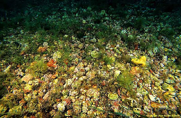 Las manchas más importantes de fondos de maërl aparecen entre punta Parda y punta de Matalentisco (figura 2) (Mapa 1), entre punta del Cambrón y Calabardina (Mapa 2), alrededor de la isla de las Palomas (figura 3) y entre punta de Loma Larga y punta Blanca (figura 4). Manchas dispersas y no muy extensas aparecen entre punta de La Azohía y cala Mojarra y entre cabo de Palos y el bajo de Fuera.
