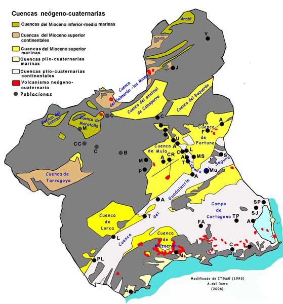 - Formación de grandes abanicos aluviales o deltaicos en los sectores de la zona de fallas de Bullas-Archena o del norte de las sierras pertenecientes a las Zonas Internas (cuencas de Lorca, Fortuna, etc.).