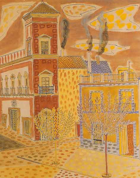 Su pintura presenta un dibujo de antecedentes cubistas y una paleta de colores nítidos.