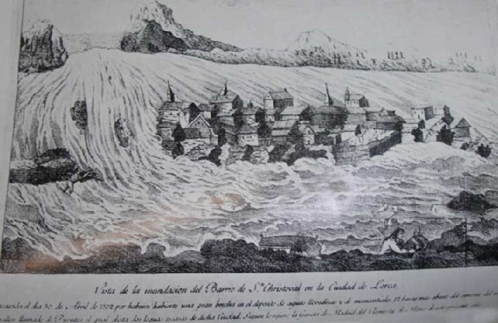 Las aguas llegaron a Lorca poco después de las cuatro de la tarde, empujando y arrastrando una gran cantidad de rocas y vigas que destrozaban todo lo que encontraban a su paso. La parte más afectada fue el barrio de San Cristóbal que estaba formado por edificios de una sola planta y algunas casonas de nobles. En San Cristobal se situaba la zona industrial de la ciudad: molinos, alfarerías, fábricas de paños, fabricas de jabón…etc. También en este barrio se encontraban el convento de frailes Mercedarios y el de San Diego. Todo ello fue rápidamente destruido. En la parroquia de San Cristóbal las aguas llegaron a cubrir los arcos de las capillas. La ermita de Nuestra Señora de la Peña, en los extramuros de la ciudad, aguas arriba del río, fue totalmente arrasada. Casi todas las casas y fábricas del barrio se vieron afectadas.