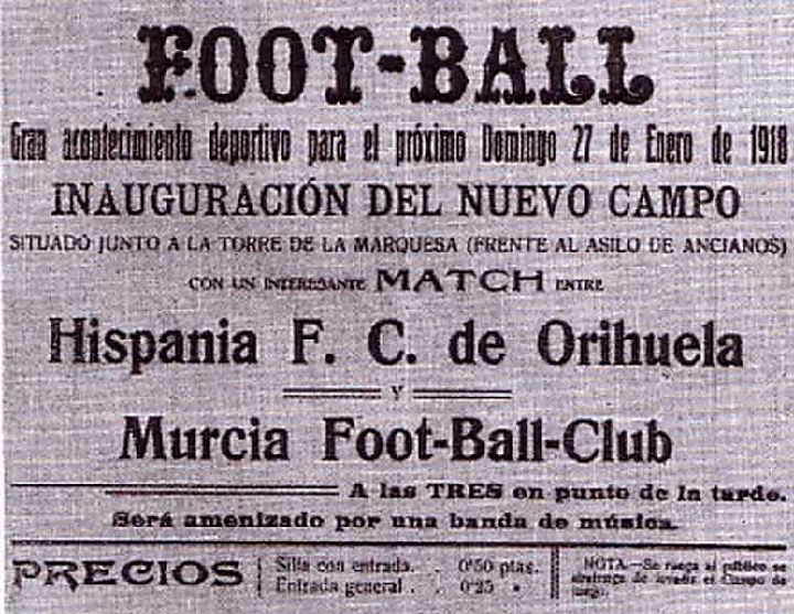El 27 de enero de 1918, a las tres de la tarde, se inauguró el campo de fútbol de La Torre de la Marquesa en un encuentro que enfrentó al Murcia Foot Ball Club y al Hispania. Para atraer a los ciudadanos al campo, la directiva contrató a una charanga de Santiago y Zaraiche. En la víspera del partido hubo pasacalles por toda Murcia, lanzamiento de cohetes y reparto de prospectos. La entrada más cara, con derecho a asiento, era de 50 céntimos, mientras que el precio de la general valía la mitad. Sin embargo, la asistencia de espectadores fue muy escasa porque el fútbol aún no había alcanzado las cotas de popularidad que tenía en otros lugares y porque algunas horas antes del encuentro cayó una fuerte lluvia que retrajo la asistencia de los aficionados.