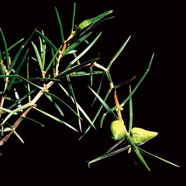 Hojas aciculares verdes (hasta 20 mm de longitud y 1-2 mm de anchura), agudas, punzantes, con dos bandas blancas en el haz (líneas estomáticas).