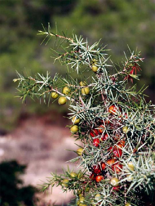 Infrutescencia: gálbulo de 12-15 mm de diámetro, globoso (ligeramente piriforme), amarillento o castaño claro, pruinoso cuando joven, castaño-rojizo al madurar.