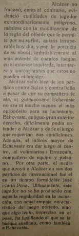El periodista catalán Juan Fontanet escribió un artículo al respecto en el que mostraba su extrañeza por esta decisión. "¿Por qué se viene prescindiendo de Alcázar? ¿Por qué razón no se cuenta o no se quiere contar ya con el excelente jugador que en los partidos contra Suiza en Berna y contra Italia en Valencia una muestra tan incontestable de su valer dio?. Alcázar no fracasó, antes, al contrario, evidenció cualidades de jugador altamente peligroso, máxime con la modificación de la regla del offside, que le permite por su sprint, quizás insuperable hoy día, y por la potencia de su shoot, indudablemente el más potente de cuantos juegan por el exterior izquierda, internarse y marcar tantos que otros no pueden ni intentar".