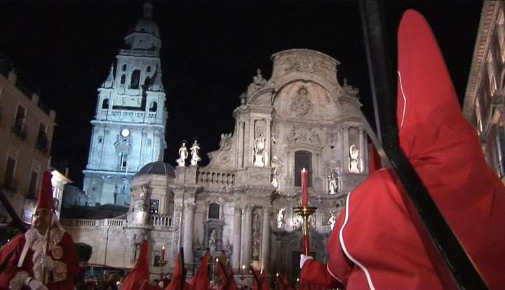 La estampa del cortejo de los "los coloraos" cruzando el Puente Viejo es única e inigualable en la Semana Santa murciana. Esta archicofradía invierte más de seis horas en realizar su recorrido por la ciudad, dándose la circunstancia de que cuando está terminando de salir a la calle, la cabeza del cortejo ya se encuentra en los aledaños de la iglesia del Carmen para empezar a recogerse.