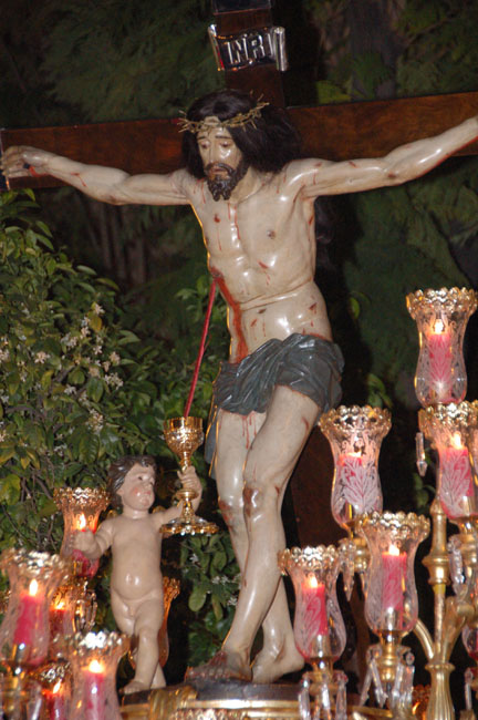 manos y los pies desclavados que pisan las uvas en el lagar y derrama su sangre redentora, la cual recoge un