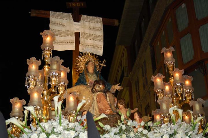 Tiene su origen en la Iglesia del entonces Hospital de Santa Maria de Gracia y Buen Suceso, entorno al año 1570, fecha en que se encargó la imagen del Santísimo Cristo Yacente, atribuida al escultor D. Diego de Ayala. De este enclave se sacan las imágenes de La Soledad y Cristo Yacente con intención de trasladarlas a la iglesia de San Francisco. Entre 1693 y 1705 la cofradía encargó una nueva imagen del Cristo Yacente al escultor Nicolás de Bussy aunque la que desfila actualmente es la encargada al escultor murciano D. Juan González Moreno.