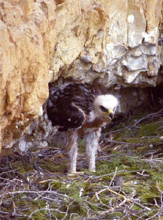 Los pollos son criados por la hembra, que comienza a alimentarlos inmediatamente después de su nacimiento. El procedimiento seguido es el típico entre las aves rapaces, mientras asegura fuertemente la presa con sus garras, arranca pequeños trocitos con su pico que presenta a sus polluelos.