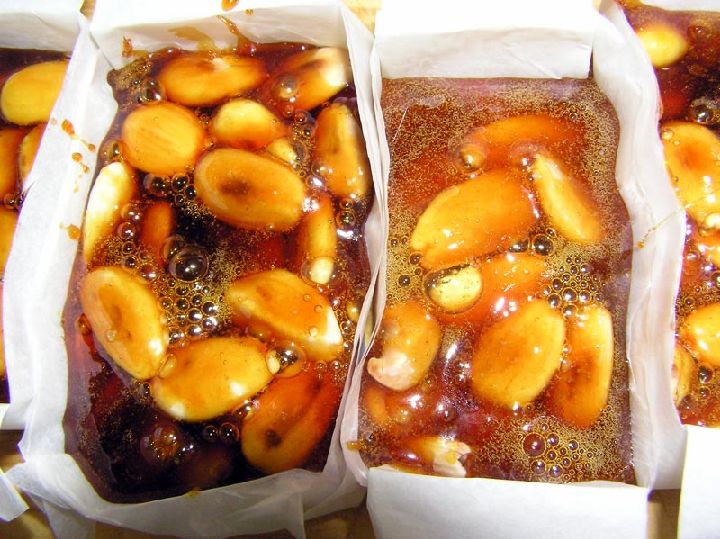 Ya sólo quedará echar con cuidado el caramelo en las cajitas hasta cubrir las almendras y esperar a que se enfríe. Y listo el guirlache.