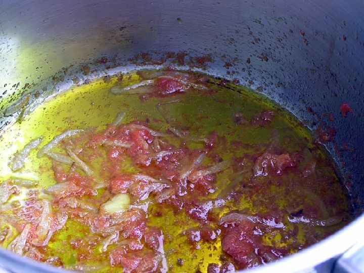 En la misma olla express en la que coceremos todo hacemos el sofrito con el tomate, la cebolla, el ajo, el aceite y, siempre por último, el pimentón.