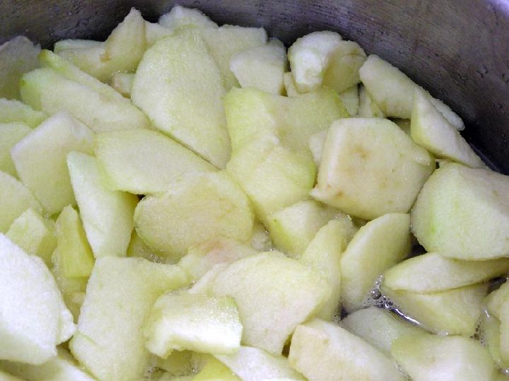 La manzana que se utilizará estará preparada en forma de compota, aunque no hay que llegar a triturar la fruta. Ya peladas las manzanas se echarán en trozos en una cazuela, se añadirá azúcar y se cocerán hasta que queden blandas.