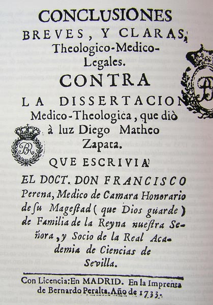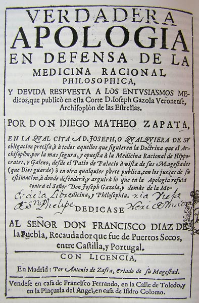 Sus buenas aptitudes para la medicina le permiten llegar hasta la corte, donde ejercería su profesión, si bien no de forma oficial, ya que en 1726 una orden real exige documentos de limpieza de sangre (ser hijo de cristianos viejos) para ejercer la profesión. Pero Zapata llegaría a tener ilustres pacientes como los cardenales Portocarrero y Borja, los marqueses de Priego o los duques de Medinaceli.