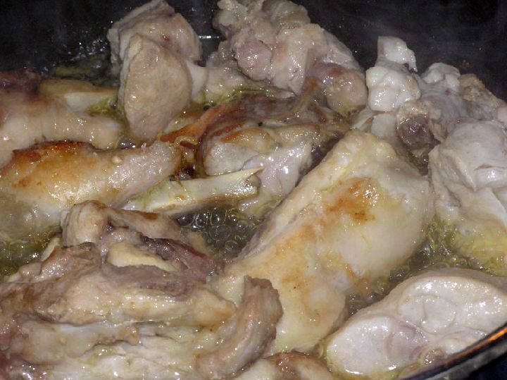 El conejo, limpio y cortado, se freirá en una sartén con aceite, y ya frito se incorporará a la salsa de tomate, junto al pimiento. Se dejará calentar todo junto y ya estará listo para comer, acompañado de un buen pan será un plato para disfrutar.