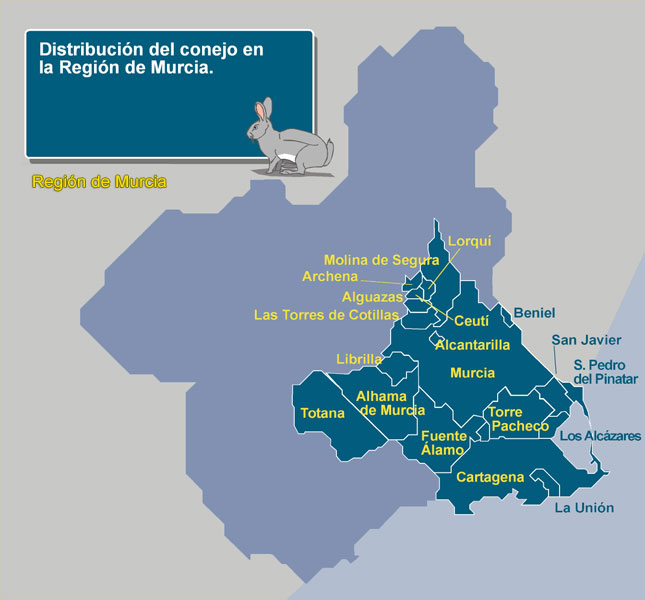 La Región de Murcia presenta condiciones inmejorables para la cría y reproducción del conejo de monte en libertad. Las amplias zonas de matorral mediterráneo localizadas junto a cultivos y relieves en llano presentan una numerosa población, localizándose grupos más numerosos en dehesas con abundante matorral y pastizales. El conejo de monte se localiza en altitudes inferiores a los 1.500 metros, siendo el clima idóneo para la especie el mediterráneo, árido y caluroso.