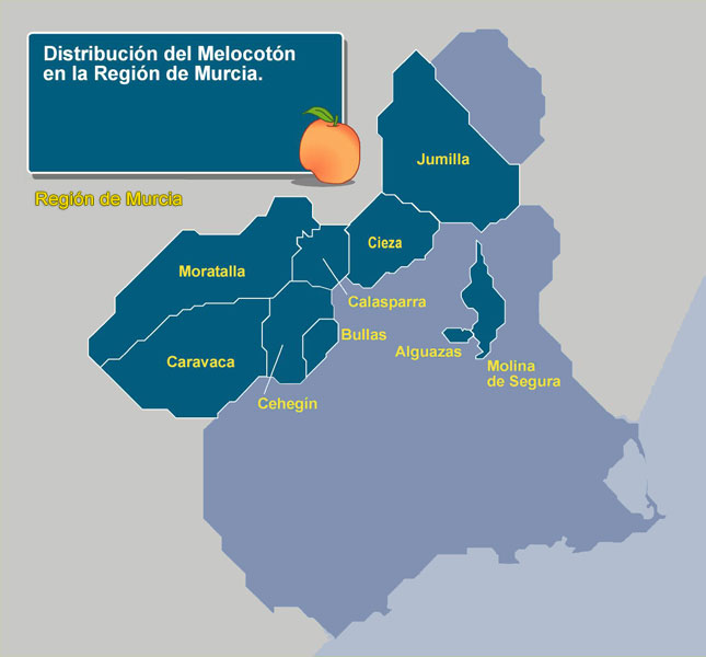 El municipio de Jumilla cuenta con una alta producción de melocotones tanto para consumo al fresco como para la elaboración de zumos. Así mismo tiene una producción elevada en la Comarca del Noroeste e históricamente en Molina de Segura