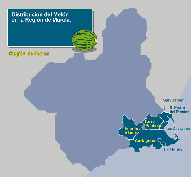 Aunque existen varios municipios de la región que albergan plantaciones de melones, las más representativas son las que forman parte de la I.G.P. Melón de Torre Pacheco, constituida por los cultivos ubicados en Cartagena, Fuente Álamo, La Unión, Los Alcázares, San Javier, San Pedro del Pinatar, Torre Pacheco y Murcia en su pedanías de Avileses, Baños y Mendigo, Corvera, Gea y Truyols, Lobosillo, Los Martínez del Puerto, Valladolises y Sucina.