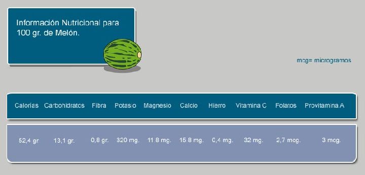 El melón se consume prácticamente durante todo el año, aportando sus beneficios como hidratante (está compuesto en un 80% por agua) además de poseer la ventaja de aportar muy pocas calorías, quedando especialmente indicado en dietas de control de peso o control específico que incidan en la disminución de los hidratos de carbono como es el caso de las personas diabéticas.