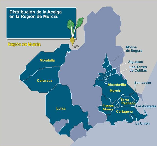 En la Región de Murcia crece de forma silvestre la Acelga del Campo, no obstante se ha desarrollado el cultivo de esta verdura principalmente en la Huerta de Murcia, Campo de Cartagena, Lorca y Comarca del Noroeste. En los municipios y pedanías cercanos a la vega del Segura a su paso por la capital de la región es habitual encontrar plantaciones de acelgas y otras hortalizas que han sustituido en los últimos años a diversos frutales, así como el ahorro de costes en su riego y recogida. En el Campo de Cartagena la llegada en las últimas décadas del siglo XX de las aguas del Trasvase Tajo-Segura propiciaron el cambio de una agricultura extensiva de secano a ciertas plantaciones de regadío entre las que se encuentran numerosas variedades de hortalizas.