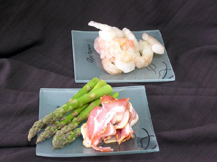 Los langostinos deben estar crudos y pelados, no importa que sean congelados siempre que sea un producto de calidad. Los espárragos verdes se blanquearán, es decir, se hervirán sólo unos 10 minutos, ya que en la plancha volverán a recibir calor.